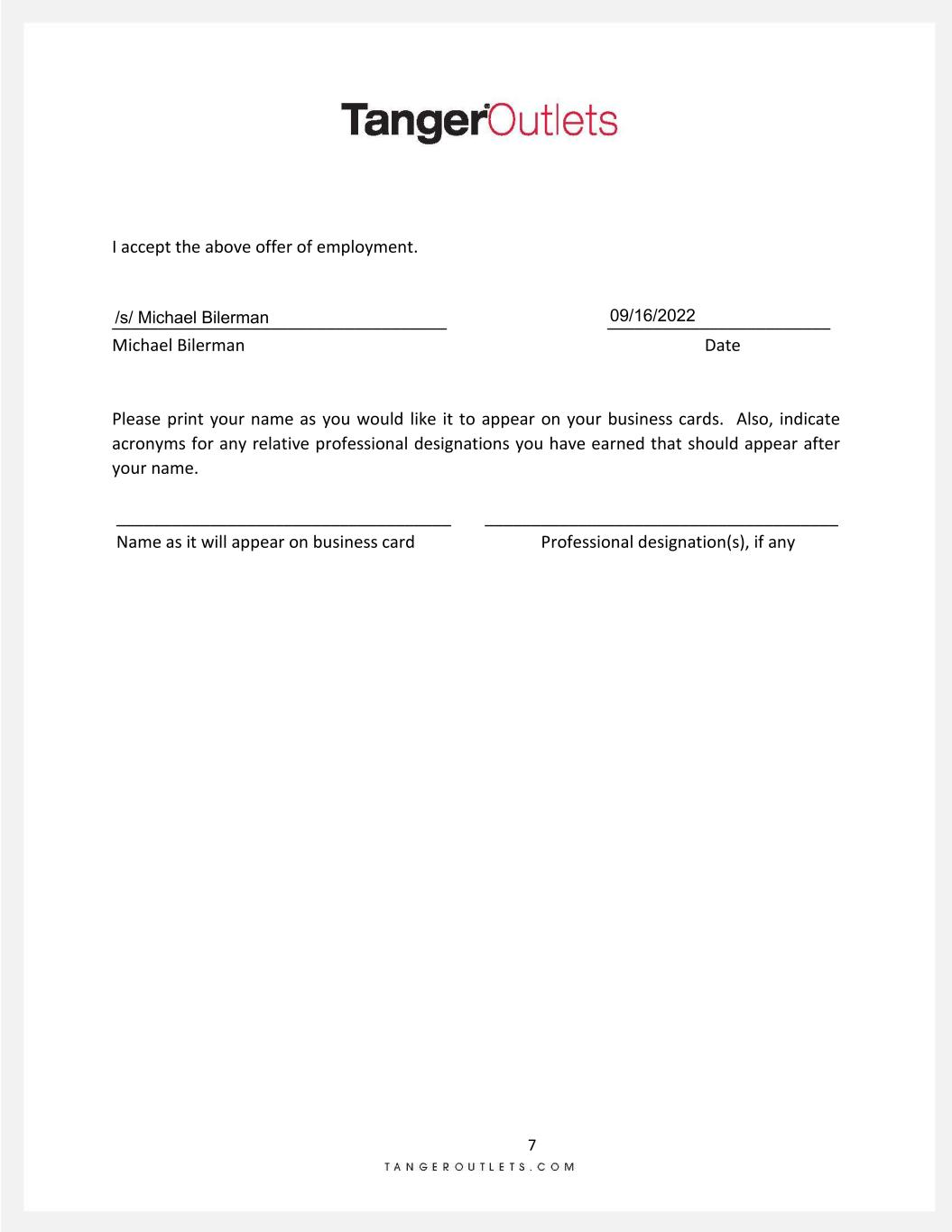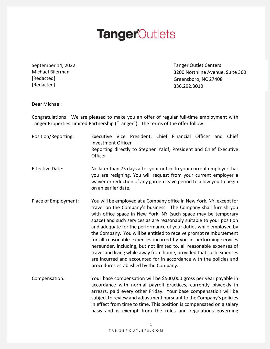 1 September 14, 2022 Michael Bilerman [Redacted] [Redacted] Dear Michael: Congratulations! We are pleased to make you an offer of regular full-time employment with Tanger Properties Limited Partnership (“Tanger”). The terms of the offer follow: Position/Reporting: Executive Vice President, Chief Financial Officer and Chief Investment Officer Reporting directly to Stephen Yalof, President and Chief Executive Officer Effective Date: Place of Employment: No later than 75 days after your notice to your current employer that you are resigning. You will request from your current employer a waiver or reduction of any garden leave period to allow you to begin on an earlier date. You will be employed at a Company office in New York, NY, except for travel on the Company’s business. The Company shall furnish you with office space in New York, NY (such space may be temporary space) and such services as are reasonably suitable to your position and adequate for the performance of your duties while employed by the Company. You will be entitled to receive prompt reimbursement for all reasonable expenses incurred by you in performing services hereunder, including, but not limited to, all reasonable expenses of travel and living while away from home, provided that such expenses are incurred and accounted for in accordance with the policies and procedures established by the Company. Compensation: Your base compensation will be $500,000 gross per year payable in accordance with normal payroll practices, currently biweekly in arrears, paid every other Friday. Your base compensation will be subject to review and adjustment pursuant to the Company’s policies in effect from time to time. This position is compensated on a salary basis and is exempt from the rules and regulations governing Tanger Outlet Centers 3200 Northline Avenue, Suite 360 Greensboro, NC 27408 336.292.3010