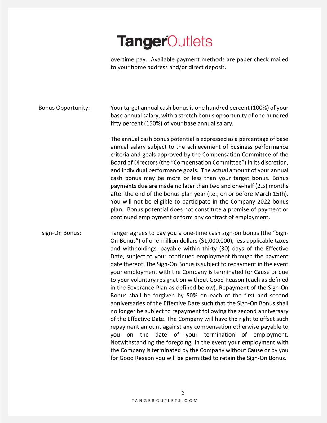 2 overtime pay. Available payment methods are paper check mailed to your home address and/or direct deposit. Bonus Opportunity: Sign-On Bonus: Your target annual cash bonus is one hundred percent (100%) of your base annual salary, with a stretch bonus opportunity of one hundred fifty percent (150%) of your base annual salary. The annual cash bonus potential is expressed as a percentage of base annual salary subject to the achievement of business performance criteria and goals approved by the Compensation Committee of the Board of Directors (the “Compensation Committee”) in its discretion, and individual performance goals. The actual amount of your annual cash bonus may be more or less than your target bonus. Bonus payments due are made no later than two and one-half (2.5) months after the end of the bonus plan year (i.e., on or before March 15th). You will not be eligible to participate in the Company 2022 bonus plan. Bonus potential does not constitute a promise of payment or continued employment or form any contract of employment. Tanger agrees to pay you a one-time cash sign-on bonus (the “Sign- On Bonus”) of one million dollars ($1,000,000), less applicable taxes and withholdings, payable within thirty (30) days of the Effective Date, subject to your continued employment through the payment date thereof. The Sign-On Bonus is subject to repayment in the event your employment with the Company is terminated for Cause or due to your voluntary resignation without Good Reason (each as defined in the Severance Plan as defined below). Repayment of the Sign-On Bonus shall be forgiven by 50% on each of the first and second anniversaries of the Effective Date such that the Sign-On Bonus shall no longer be subject to repayment following the second anniversary of the Effective Date. The Company will have the right to offset such repayment amount against any compensation otherwise payable to you on the date of your termination of employment. Notwithstanding the foregoing, in the event your employment with the Company is terminated by the Company without Cause or by you for Good Reason you will be permitted to retain the Sign-On Bonus.