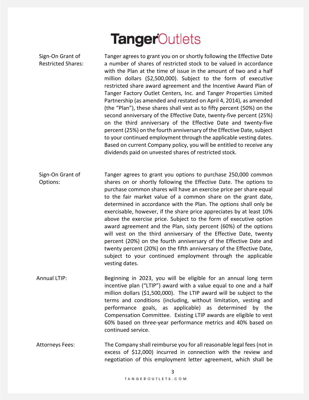 3 Sign-On Grant of Restricted Shares: Sign-On Grant of Options: Tanger agrees to grant you on or shortly following the Effective Date a number of shares of restricted stock to be valued in accordance with the Plan at the time of issue in the amount of two and a half million dollars ($2,500,000). Subject to the form of executive restricted share award agreement and the Incentive Award Plan of Tanger Factory Outlet Centers, Inc. and Tanger Properties Limited Partnership (as amended and restated on April 4, 2014), as amended (the “Plan”), these shares shall vest as to fifty percent (50%) on the second anniversary of the Effective Date, twenty-five percent (25%) on the third anniversary of the Effective Date and twenty-five percent (25%) on the fourth anniversary of the Effective Date, subject to your continued employment through the applicable vesting dates. Based on current Company policy, you will be entitled to receive any dividends paid on unvested shares of restricted stock. Tanger agrees to grant you options to purchase 250,000 common shares on or shortly following the Effective Date. The options to purchase common shares will have an exercise price per share equal to the fair market value of a common share on the grant date, determined in accordance with the Plan. The options shall only be exercisable, however, if the share price appreciates by at least 10% above the exercise price. Subject to the form of executive option award agreement and the Plan, sixty percent (60%) of the options will vest on the third anniversary of the Effective Date, twenty percent (20%) on the fourth anniversary of the Effective Date and twenty percent (20%) on the fifth anniversary of the Effective Date, subject to your continued employment through the applicable vesting dates. Annual LTIP: Attorneys Fees: Beginning in 2023, you will be eligible for an annual long term incentive plan (“LTIP”) award with a value equal to one and a half million dollars ($1,500,000). The LTIP award will be subject to the terms and conditions (including, without limitation, vesting and performance goals, as applicable) as determined by the Compensation Committee. Existing LTIP awards are eligible to vest 60% based on three-year performance metrics and 40% based on continued service. The Company shall reimburse you for all reasonable legal fees (not in excess of $12,000) incurred in connection with the review and negotiation of this employment letter agreement, which shall be