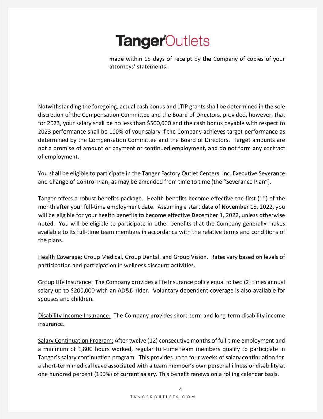 4 made within 15 days of receipt by the Company of copies of your attorneys’ statements. Notwithstanding the foregoing, actual cash bonus and LTIP grants shall be determined in the sole discretion of the Compensation Committee and the Board of Directors, provided, however, that for 2023, your salary shall be no less than $500,000 and the cash bonus payable with respect to 2023 performance shall be 100% of your salary if the Company achieves target performance as determined by the Compensation Committee and the Board of Directors. Target amounts are not a promise of amount or payment or continued employment, and do not form any contract of employment. You shall be eligible to participate in the Tanger Factory Outlet Centers, Inc. Executive Severance and Change of Control Plan, as may be amended from time to time (the “Severance Plan”). Tanger offers a robust benefits package. Health benefits become effective the first (1st) of the month after your full-time employment date. Assuming a start date of November 15, 2022, you will be eligible for your health benefits to become effective December 1, 2022, unless otherwise noted. You will be eligible to participate in other benefits that the Company generally makes available to its full-time team members in accordance with the relative terms and conditions of the plans. Health Coverage: Group Medical, Group Dental, and Group Vision. Rates vary based on levels of participation and participation in wellness discount activities. Group Life Insurance: The Company provides a life insurance policy equal to two (2) times annual salary up to $200,000 with an AD&D rider. Voluntary dependent coverage is also available for spouses and children. Disability Income Insurance: The Company provides short-term and long-term disability income insurance. Salary Continuation Program: After twelve (12) consecutive months of full-time employment and a minimum of 1,800 hours worked, regular full-time team members qualify to participate in Tanger’s salary continuation program. This provides up to four weeks of salary continuation for a short-term medical leave associated with a team member’s own personal illness or disability at one hundred percent (100%) of current salary. This benefit renews on a rolling calendar basis.