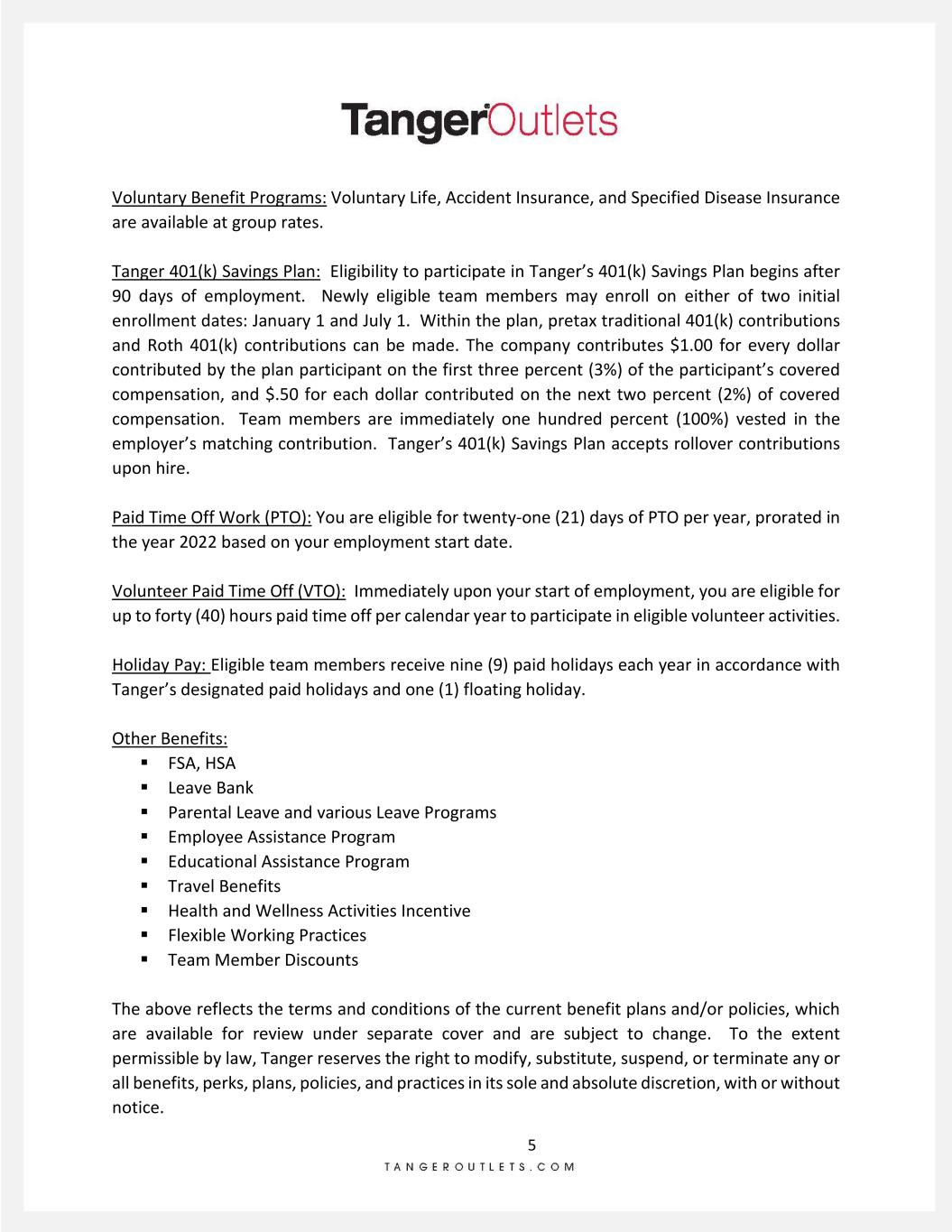 5 Voluntary Benefit Programs: Voluntary Life, Accident Insurance, and Specified Disease Insurance are available at group rates. Tanger 401(k) Savings Plan: Eligibility to participate in Tanger’s 401(k) Savings Plan begins after 90 days of employment. Newly eligible team members may enroll on either of two initial enrollment dates: January 1 and July 1. Within the plan, pretax traditional 401(k) contributions and Roth 401(k) contributions can be made. The company contributes $1.00 for every dollar contributed by the plan participant on the first three percent (3%) of the participant’s covered compensation, and $.50 for each dollar contributed on the next two percent (2%) of covered compensation. Team members are immediately one hundred percent (100%) vested in the employer’s matching contribution. Tanger’s 401(k) Savings Plan accepts rollover contributions upon hire. Paid Time Off Work (PTO): You are eligible for twenty-one (21) days of PTO per year, prorated in the year 2022 based on your employment start date. Volunteer Paid Time Off (VTO): Immediately upon your start of employment, you are eligible for up to forty (40) hours paid time off per calendar year to participate in eligible volunteer activities. Holiday Pay: Eligible team members receive nine (9) paid holidays each year in accordance with Tanger’s designated paid holidays and one (1) floating holiday. Other Benefits: FSA, HSA Leave Bank Parental Leave and various Leave Programs Employee Assistance Program Educational Assistance Program Travel Benefits Health and Wellness Activities Incentive Flexible Working Practices Team Member Discounts The above reflects the terms and conditions of the current benefit plans and/or policies, which are available for review under separate cover and are subject to change. To the extent permissible by law, Tanger reserves the right to modify, substitute, suspend, or terminate any or all benefits, perks, plans, policies, and practices in its sole and absolute discretion, with or without notice.