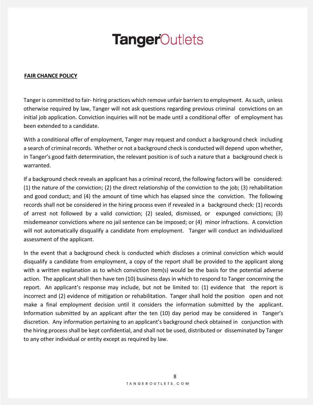 8 FAIR CHANCE POLICY Tanger is committed to fair- hiring practices which remove unfair barriers to employment. As such, unless otherwise required by law, Tanger will not ask questions regarding previous criminal convictions on an initial job application. Conviction inquiries will not be made until a conditional offer of employment has been extended to a candidate. With a conditional offer of employment, Tanger may request and conduct a background check including a search of criminal records. Whether or not a background check is conducted will depend upon whether, in Tanger’s good faith determination, the relevant position is of such a nature that a background check is warranted. If a background check reveals an applicant has a criminal record, the following factors will be considered: (1) the nature of the conviction; (2) the direct relationship of the conviction to the job; (3) rehabilitation and good conduct; and (4) the amount of time which has elapsed since the conviction. The following records shall not be considered in the hiring process even if revealed in a background check: (1) records of arrest not followed by a valid conviction; (2) sealed, dismissed, or expunged convictions; (3) misdemeanor convictions where no jail sentence can be imposed; or (4) minor infractions. A conviction will not automatically disqualify a candidate from employment. Tanger will conduct an individualized assessment of the applicant. In the event that a background check is conducted which discloses a criminal conviction which would disqualify a candidate from employment, a copy of the report shall be provided to the applicant along with a written explanation as to which conviction item(s) would be the basis for the potential adverse action. The applicant shall then have ten (10) business days in which to respond to Tanger concerning the report. An applicant’s response may include, but not be limited to: (1) evidence that the report is incorrect and (2) evidence of mitigation or rehabilitation. Tanger shall hold the position open and not make a final employment decision until it considers the information submitted by the applicant. Information submitted by an applicant after the ten (10) day period may be considered in Tanger’s discretion. Any information pertaining to an applicant’s background check obtained in conjunction with the hiring process shall be kept confidential, and shall not be used, distributed or disseminated by Tanger to any other individual or entity except as required by law.