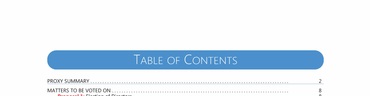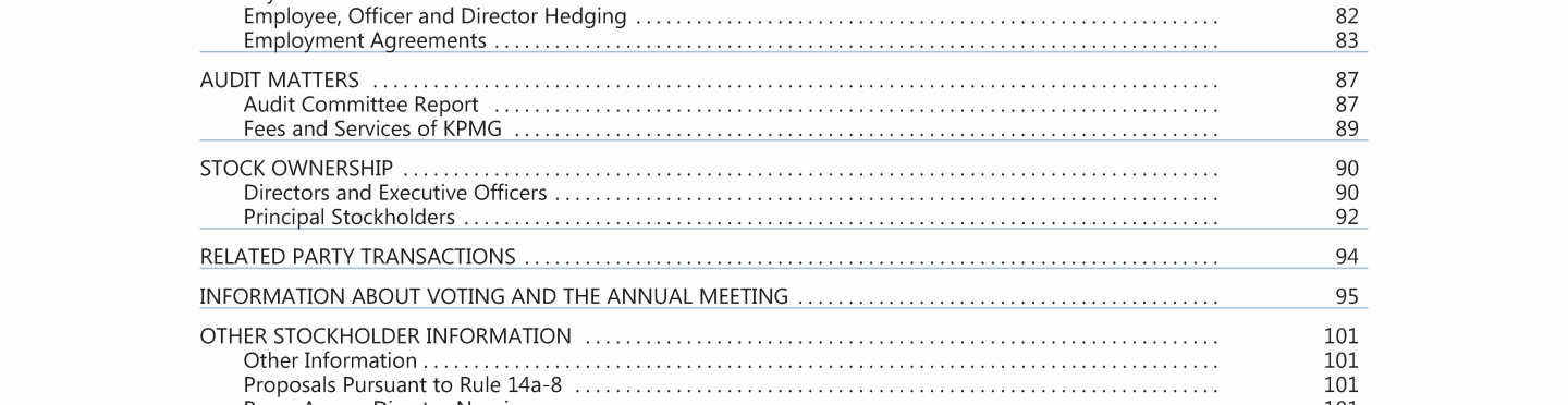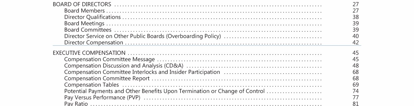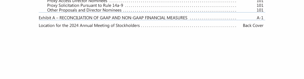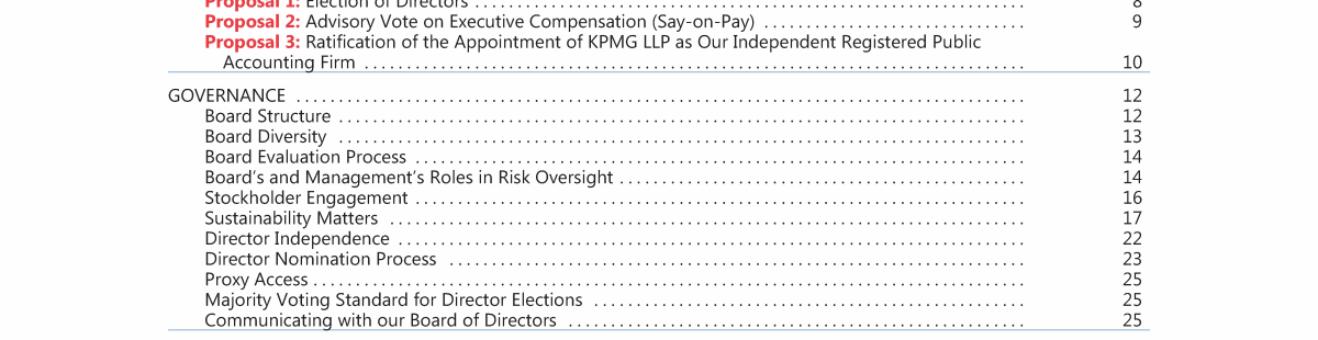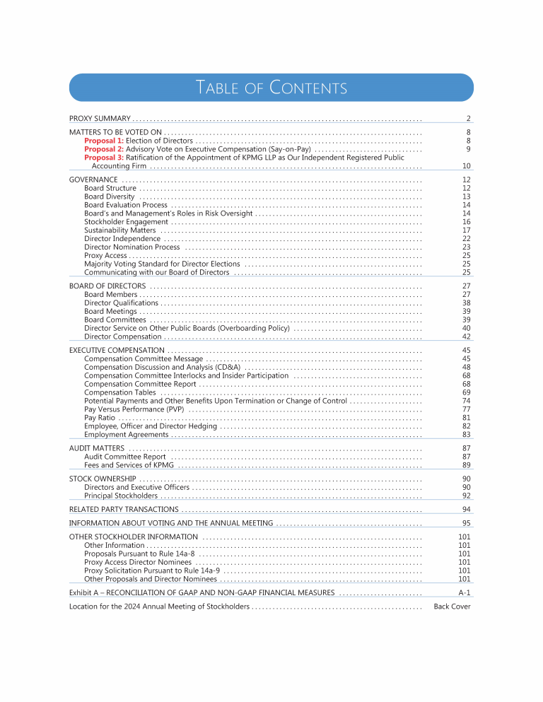 Click to view Proxy Summary Click to view Matters to Be Voted On Click to view Proposal 1: Election of Directors Click to view Proxy Summary Click to view Matters to Be Voted On Click to view Proposal 1: Election of Directors Click to view Proxy Summary Click to view Matters to Be Voted On Click to view Proposal 1: Election of Directors Click to view Proposal 1: Election of Directors Click to view Proposal 2: Advisory Vote on Executive Compensation (Say-on-Pay) Click to view Proposal 3: Ratification of the Appointment of KPMG LLP as Our Independent Registered Public Accounting Firm Click to view Governance Click to view Board Structure Click to view Board Diversity Click to view Board Evaluation Process Click to view Board's and Management's Roles in Risk Oversight Click to view Stockholder Engagement Click to view Sustainability Matters Click to view Director Independence Click to view Director Nomination Process Click to view Proxy Access Click to view Majority Voting Standard for Director Elections Click to view Communicating with our Board of Directors Click to view Proposal 1: Election of Directors Click to view Proposal 2: Advisory Vote on Executive Compensation (Say-on-Pay) Click to view Proposal 3: Ratification of the Appointment of KPMG LLP as Our Independent Registered Public Accounting Firm Click to view Governance Click to view Board Structure Click to view Board Diversity Click to view Board Evaluation Process Click to view Board's and Management's Roles in Risk Oversight Click to view Stockholder Engagement Click to view Sustainability Matters Click to view Director Independence Click to view Director Nomination Process Click to view Proxy Access Click to view Majority Voting Standard for Director Elections Click to view Communicating with our Board of Directors Click to view Proposal 1: Election of Directors Click to view Proposal 2: Advisory Vote on Executive Compensation (Say-on-Pay) Click to view Proposal 3: Ratification of the Appointment of KPMG LLP as Our Independent Registered Public Accounting Firm Click to view Governance Click to view Board Structure Click to view Board Diversity Click to view Board Evaluation Process Click to view Board's and Management's Roles in Risk Oversight Click to view Stockholder Engagement Click to view Sustainability Matters Click to view Director Independence Click to view Director Nomination Process Click to view Proxy Access Click to view Majority Voting Standard for Director Elections Click to view Communicating with our Board of Directors Click to view Board of Directors Click to view Board Members Click to view Director Qualifications Click to view Board Meetings Click to view Board Committees Click to view Director Service on Other Public Boards (Overboarding Policy) Click to view Director Compensation Click to view Executive Compensation Click to view Compensation Committee Message Click to view Compensation Discussion and Analysis (CD&A) Click to view Compensation Committee Interlocks and Insider Participation Click to view Compensation Committee Report Click to view Compensation Tables Click to view Potential Payments and Other Benefits Upon Termination or Change of Control Click to view Pay Versus Performance (PVP) Click to view Pay Ratio Click to view Board of Directors Click to view Board Members Click to view Director Qualifications Click to view Board Meetings Click to view Board Committees Click to view Director Service on Other Public Boards (Overboarding Policy) Click to view Director Compensation Click to view Executive Compensation Click to view Compensation Committee Message Click to view Compensation Discussion and Analysis (CD&A) Click to view Compensation Committee Interlocks and Insider Participation Click to view Compensation Committee Report Click to view Compensation Tables Click to view Potential Payments and Other Benefits Upon Termination or Change of Control Click to view Pay Versus Performance (PVP) Click to view Pay Ratio Click to view Board of Directors Click to view Board Members Click to view Director Qualifications Click to view Board Meetings Click to view Board Committees Click to view Director Service on Other Public Boards (Overboarding Policy) Click to view Director Compensation Click to view Executive Compensation Click to view Compensation Committee Message Click to view Compensation Discussion and Analysis (CD&A) Click to view Compensation Committee Interlocks and Insider Participation Click to view Compensation Committee Report Click to view Compensation Tables Click to view Potential Payments and Other Benefits Upon Termination or Change of Control Click to view Pay Versus Performance (PVP) Click to view Pay Ratio Click to view Pay Ratio Click to view Employee, Officer and Director Hedging Click to view Employment Agreements Click to view Audit Matters Click to view Audit Committee Report Click to view Fees and Services of KPMG Click to view Stock Ownership Click to view Directors and Executive Officers Click to view Principal Stockholders Click to view Related Party Transactions Click to view Information About Voting and the Annual Meeting Click to view Other Stockholder Information Click to view Other Information Click to view Proposals Pursuant to Rule 14a-8 Click to view Proxy Access Director Nominees Click to view Pay Ratio Click to view Employee, Officer and Director Hedging Click to view Employment Agreements Click to view Audit Matters Click to view Audit Committee Report Click to view Fees and Services of KPMG Click to view Stock Ownership Click to view Directors and Executive Officers Click to view Principal Stockholders Click to view Related Party Transactions Click to view Information About Voting and the Annual Meeting Click to view Other Stockholder Information Click to view Other Information Click to view Proposals Pursuant to Rule 14a-8 Click to view Proxy Access Director Nominees Click to view Pay Ratio Click to view Employee, Officer and Director Hedging Click to view Em