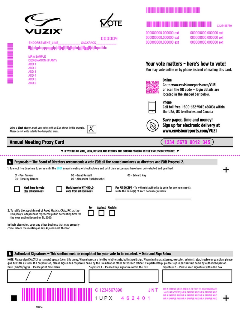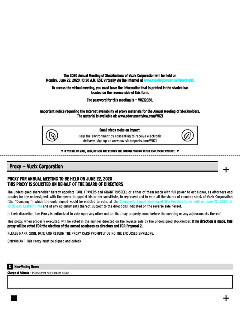 Small steps make an impact. Help the environment by consenting to receive electronic delivery, sign up at www.envisionreports.com/VUZI PROXY FOR ANNUAL MEETING TO BE HELD ON JUNE 22, 2020 THIS PROXY IS SOLICITED ON BEHALF OF THE BOARD OF DIRECTORS The undersigned shareholder hereby appoints PAUL TRAVERS and GRANT RUSSELL or either of them (each with full power to act alone), as attorneys and proxies for the undersigned, with the power to appoint his or her substitute, to represent and to vote all the shares of common stock of Vuzix Corporation (the “Company”), which the undersigned would be entitled to vote, at the Company’s Annual Meeting of Stockholders to be held on June 22, 2020, 10:30 a.m. Eastern Time and at any adjournments thereof, subject to the directions indicated on the reverse side hereof. In their discretion, the Proxy is authorized to vote upon any other matter that may properly come before the meeting or any adjournments thereof. This proxy, when properly executed, will be voted in the manner directed on the reverse side by the undersigned stockholder. If no direction is made, this proxy will be voted FOR the election of the named nominees as directors and FOR Proposal 2. PLEASE MARK, SIGN, DATE AND RETURN THE PROXY CARD PROMPTLY USING THE ENCLOSED ENVELOPE. (IMPORTANT—This Proxy must be signed and dated) Proxy — Vuzix Corporation qIF VOTING BY MAIL, SIGN, DETACH AND RETURN THE BOTTOM PORTION IN THE ENCLOSED ENVELOPE.q C Non-Voting Items + + Change of Address — Please print new address below. Important notice regarding the Internet availability of proxy materials for the Annual Meeting of Stockholders. The material is available at: www.edocumentview.com/VUZI The 2020 Annual Meeting of Stockholders of Vuzix Corporation will be held on Monday, June 22, 2020, 10:30 A.M. EST, virtually via the internet at www.meetingcenter.io/<MeetingID. To access the virtual meeting, you must have the information that is printed in the shaded bar located on the reverse side of this form. The password for this meeting is — VUZI2020.