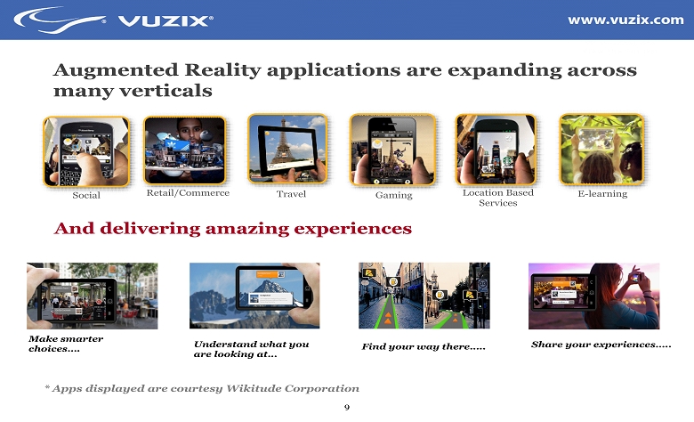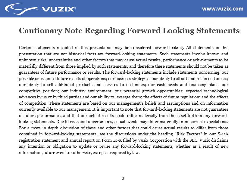 3 Certain statements included in this presentation may be considered forward - looking . All statements in this presentation that are not historical facts are forward - looking statements . Such statements involve known and unknown risks, uncertainties and other factors that may cause actual results, performance or achievements to be materially different from those implied by such statements, and therefore these statements should not be taken as guarantees of future performance or results . The forward - looking statements include statements concerning : our possible or assumed future results of operations ; our possible or assumed future results of operations ; our business strategies ; our ability to attract and retain customers ; our ability to sell additional products and services to customers ; our cash needs and financing plans ; our competitive position ; our industry environment ; our potential growth opportunities ; expected technological advances by us or by third parties and our ability to leverage them ; the effects of future regulation ; and the effects of competition . These statements are based on our management’s beliefs and assumptions and on information currently available to our management . It is important to note that forward - looking statements are not guarantees of future performance, and that our actual results could differ materially from those set forth in any forward - looking statements . Due to risks and uncertainties, actual events may differ materially from current expectations . For a more in depth discussion of these and other factors that could cause actual results to differ from those contained in forward - looking statements, see the discussions under the heading "Risk Factors" in our S - 1 /A registration statement and annual report on Form 10 - K filed by Vuzix Corporation with the SEC . Vuzix disclaims any intention or obligation to update or revise any forward - looking statements, whether as a result of new information, future events or otherwise, except as required by law . Cautionary Note Regarding Forward Looking Statements