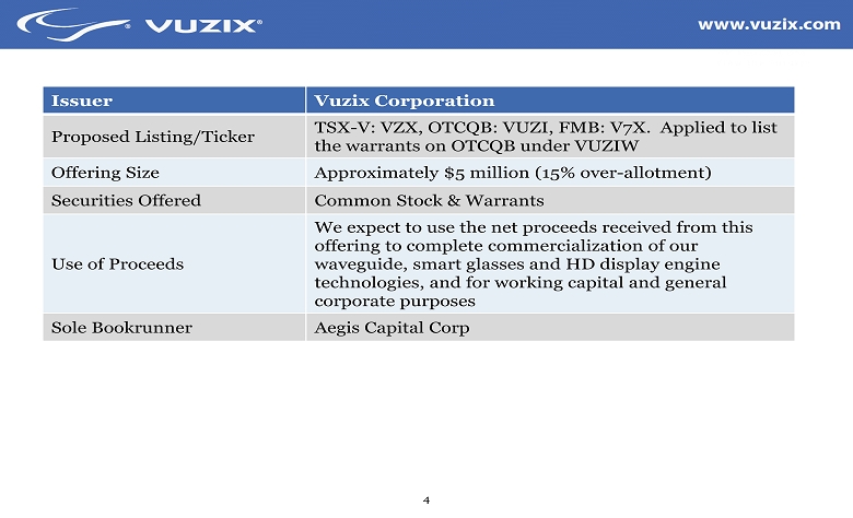 4 Offering Details Issuer Vuzix Corporation Proposed Listing/Ticker TSX - V: VZX, OTCQB: VUZI, FMB: V7X. Applied to list the warrants on OTCQB under VUZIW Offering Size Approximately $5 million (15% over - allotment) Securities Offered Common Stock & Warrants Use of Proceeds We expect to use the net proceeds received from this offering to complete commercialization of our waveguide, smart glasses and HD display engine technologies , and for working capital and general corporate purposes Sole Bookrunner Aegis Capital Corp