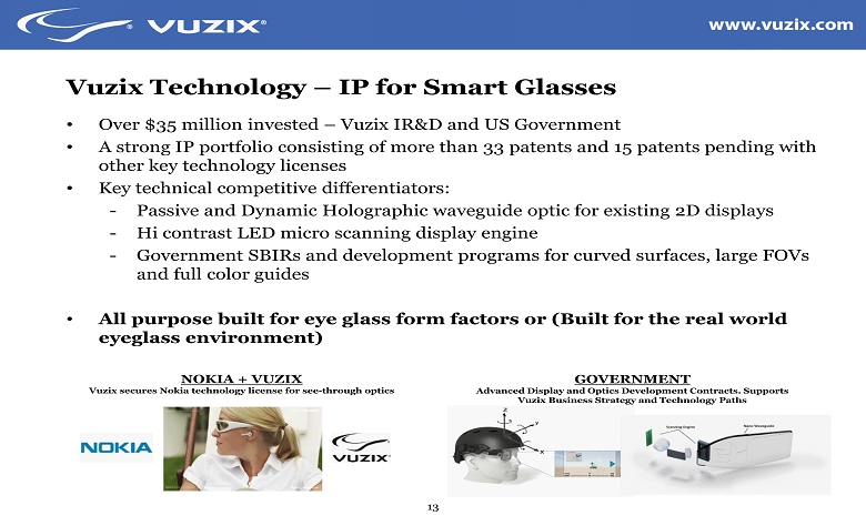 12 Smart Glasses • The Solution - Video glasses afford big screens in a compact, wearable package - Wearable interactive displays with private viewing anytime, anywhere - The perfect hands free mobile phone display screen • The Challenges - Make them like regular eyeglasses - Make them HD, smart and see - through