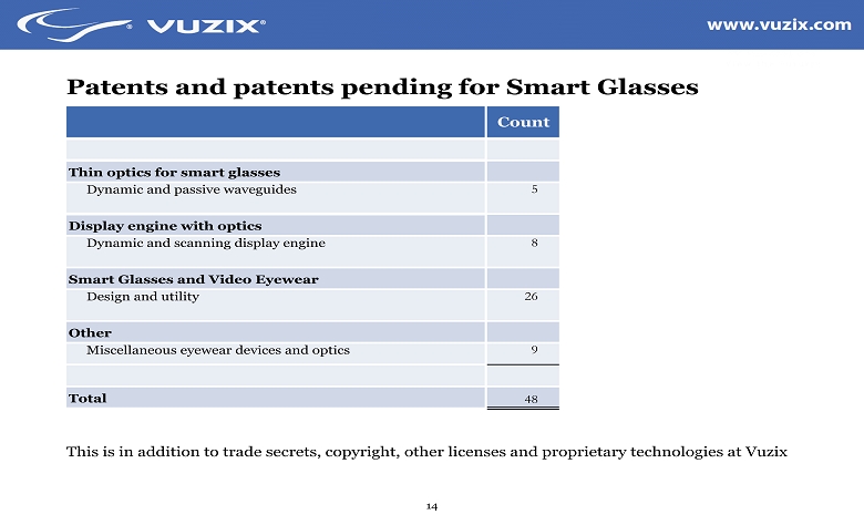 14 Patents and patents pending for Smart Glasses This is in addition to trade secrets, copyright, other licenses and proprietary technologies at Vuzix Count Thin optics for smart glasses Dynamic and passive waveguides 5 Display engine with optics Dynamic and scanning display engine 8 Smart Glasses and Video Eyewear Design and utility 26 Other Miscellaneous eyewear devices and optics 9 Total 48