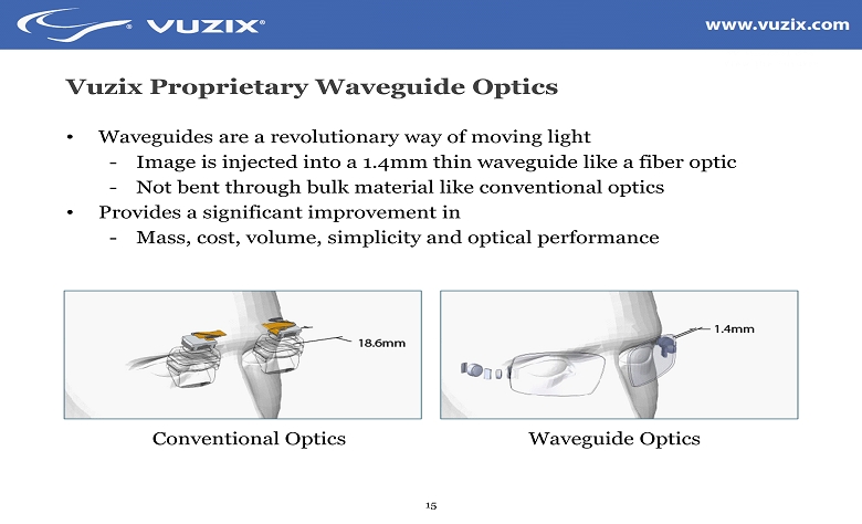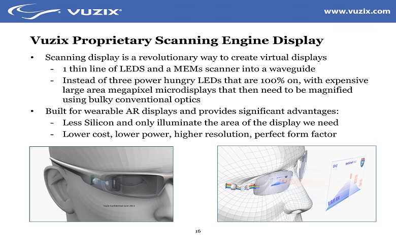 15 Vuzix Proprietary Waveguide Optics • Waveguides are a revolutionary way of moving light - Image is injected into a 1.4mm thin waveguide like a fiber optic - Not bent through bulk material like conventional optics • Provides a significant improvement in - Mass, cost, volume, simplicity and optical performance Conventional Optics Waveguide Optics
