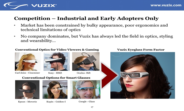 16 Vuzix Proprietary Scanning Engine Display • Scanning display is a revolutionary way to create virtual displays - 1 thin line of LEDS and a MEMs scanner into a waveguide - Instead of three power hungry LEDs that are 100% on, with expensive large area megapixel microdisplays that then need to be magnified using bulky conventional optics • Built for wearable AR displays and provides significant advantages: - Less Silicon and only illuminate the area of the display we need - Lower cost , lower power, higher resolution, perfect form factor