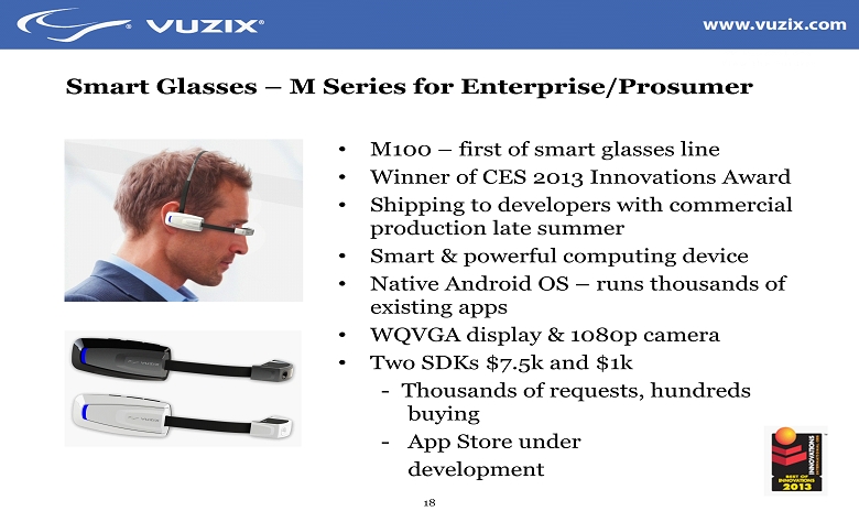17 Competition – Industrial and Early Adopters Only • Market has been constrained by bulky appearance, poor ergonomics and technical limitations of optics • No company dominates, but Vuzix has always led the field in optics, styling and wearability… Conventional Optics for Video Viewers & Gaming Vuzix Eyeglass Form Factor Conventional Options for Smart Glasses Carl Zeiss - Cinemizer Sony - HMZ Epson - Moverio Google - Glass Kopin - Golden - I Oculus - Rift