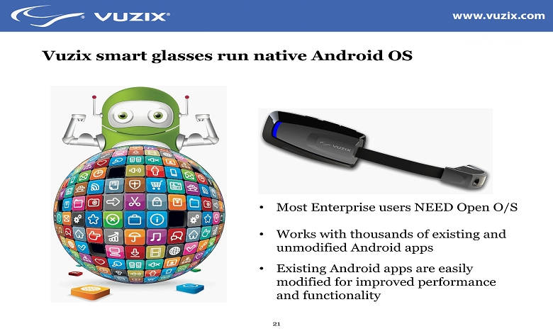 21 Vuzix smart glasses run native Android OS • Most Enterprise users NEED Open O/S • Works with thousands of existing and unmodified Android apps • Existing Android apps are easily modified for improved performance and functionality