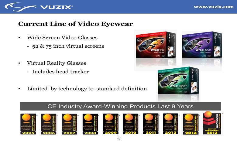 30 • Wide Screen Video Glasses - 52 & 75 inch v irtual screens • Virtual Reality Glasses - Includes head tracker • Limited by technology to standard definition CE Industry Award - Winning Products Last 9 Years Current Line of Video Eyewear