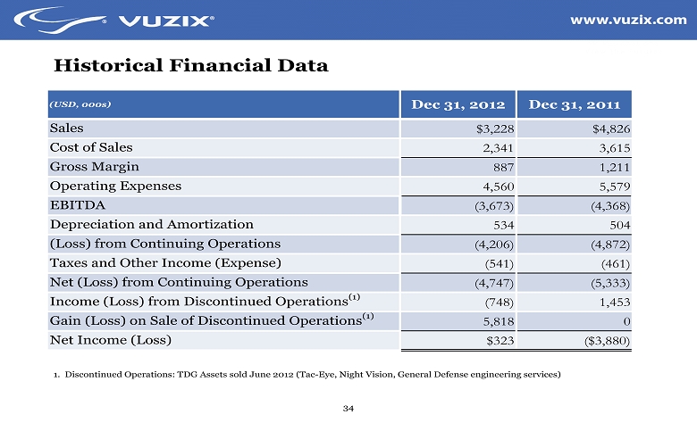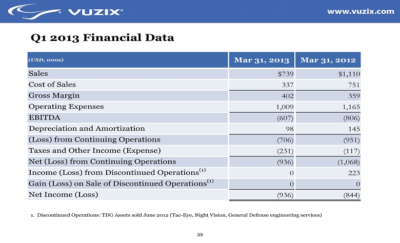34 (USD, 000s) Dec 31, 2012 Dec 31, 2011 Sales $3,228 $4,826 Cost of Sales 2,341 3,615 Gross Margin 887 1,211 Operating Expenses 4,560 5,579 EBITDA (3,673) (4,368) Depreciation and Amortization 534 504 (Loss) from Continuing Operations (4,206) (4,872) Taxes and Other Income (Expense) (541) (461) Net (Loss) from Continuing Operations (4,747) (5,333) Income (Loss) from Discontinued Operations (1) (748) 1,453 Gain (Loss) on Sale of Discontinued Operations (1) 5,818 0 Net Income (Loss) $323 ($3,880) Historical Financial Data 1. Discontinued Operations: TDG Assets sold June 2012 (Tac - Eye, Night Vision, General Defense engineering services)