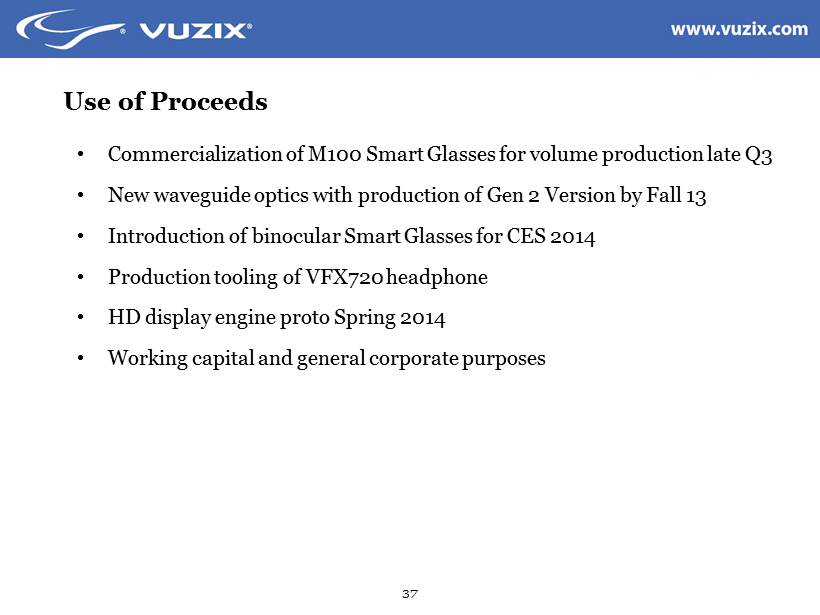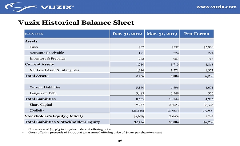 36 Vuzix Historical Balance Sheet • Conversion of $4,403 in long - term debt at offering price • Gross offering proceeds of $5,000 at an assumed offering price of $7.00 per share/warrant (USD, 000s) Dec. 31, 2012 Mar. 31, 2013 Pro-Forma Assets Cash $67 $532 $3,930 Accounts Receivable 171 224 224 Inventory & Prepaids 972 957 714 Current Assets 1,210 1,713 4,868 Net Fixed Asset & Intangibles 1,216 1,371 1,371 Total Assets 2,426 3,084 6,239 Current Liabilities 5,150 6,596 4,671 Long-term Debt 3,485 3,548 325 Total Liabilities 8,635 10,144 4,996 Share Capital 19,937 20,023 28,325 (Deficit) (26,146) (27,083) (27,083) Stockholder's Equity (Deficit) (6,209) (7,060) 1,242 Total Liabilities & Stockholders Equity $2,426 $3,084 $6,239