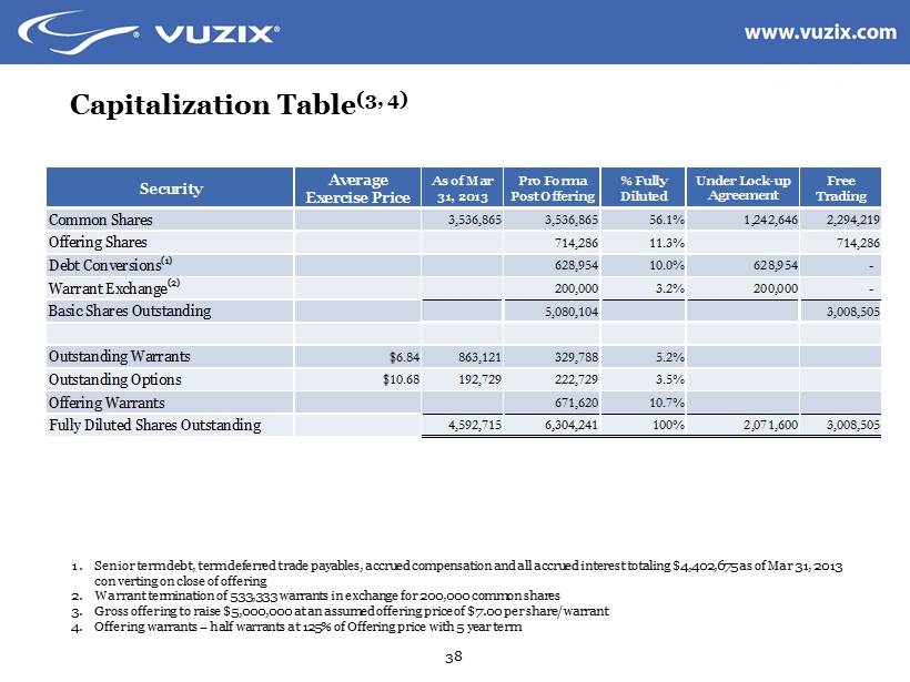37 Use of Proceeds • Commercialization of M100 Smart Glasses for volume production late Q3 • New waveguide optics with production of Gen 2 Version by Fall 13 • Introduction of binocular Smart Glasses for CES 2014 • Production tooling of VFX720 headphone • HD display engine proto spring 2014 • Working capital and general corporate purposes
