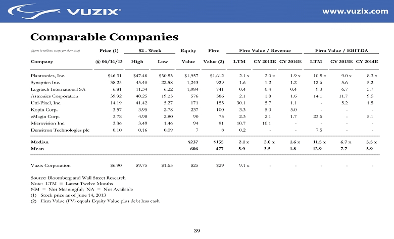 39 Comparable Companies (figures in millions, except per share data) Price (1) 52 - Week Equity Firm Firm Value / Revenue Firm Value / EBITDA Company @ 06/14/13 High Low Value Value (2) LTM CY 2013E CY 2014E LTM CY 2013E CY 2014E Plantronics, Inc. $46.31 $47.48 $30.53 $1,957 $1,612 2.1 x 2.0 x 1.9 x 10.5 x 9.0 x 8.3 x Synaptics Inc. 38.25 45.40 22.58 1,243 929 1.6 1.2 1.2 12.6 5.6 5.2 Logitech International SA 6.81 11.34 6.22 1,084 741 0.4 0.4 0.4 9.3 6.7 5.7 Astronics Corporation 39.92 40.25 19.25 576 586 2.1 1.8 1.6 14.1 11.7 9.5 Uni-Pixel, Inc. 14.19 41.42 5.27 171 155 30.1 5.7 1.1 - 5.2 1.5 Kopin Corp. 3.57 3.95 2.78 237 100 3.3 5.0 5.0 - - - eMagin Corp. 3.78 4.98 2.80 90 75 2.3 2.1 1.7 23.6 - 5.1 Microvision Inc. 3.36 3.49 1.46 94 91 10.7 10.1 - - - - Densitron Technologies plc 0.10 0.16 0.09 7 8 0.2 - - 7.5 - - Median $237 $155 2.1 x 2.0 x 1.6 x 11.5 x 6.7 x 5.5 x Mean 606 477 5.9 3.5 1.8 12.9 7.7 5.9 Vuzix Corporation $6.90 $9.75 $1.65 $25 $29 9.1 x - - - - - Source: Bloomberg and Wall Street Research Note: LTM = Latest Twelve Months NM = Not Meaningful; NA = Not Available (1) Stock price as of June 14, 2013 (2) Firm Value (FV) equals Equity Value plus debt less cash