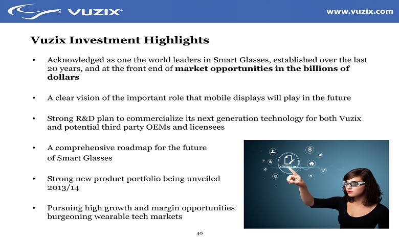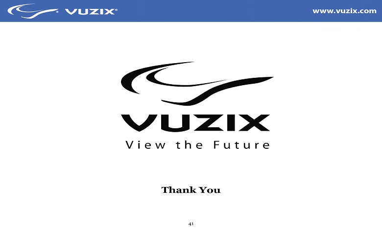 40 Vuzix Investment Highlights • A cknowledged as one the world leaders in Smart Glasses, established over the last 20 years, and at the front end of market opportunities in the billions of dollars • A clear vision of the important role that mobile displays will play in the future • Strong R&D plan to commercialize its next generation technology for both Vuzix and potential third party OEMs and licensees • A comprehensive roadmap for the future of Smart Glasses • Strong new product portfolio being unveiled in 2013/14 • Pursuing high growth and margin opportunities in burgeoning wearable tech markets