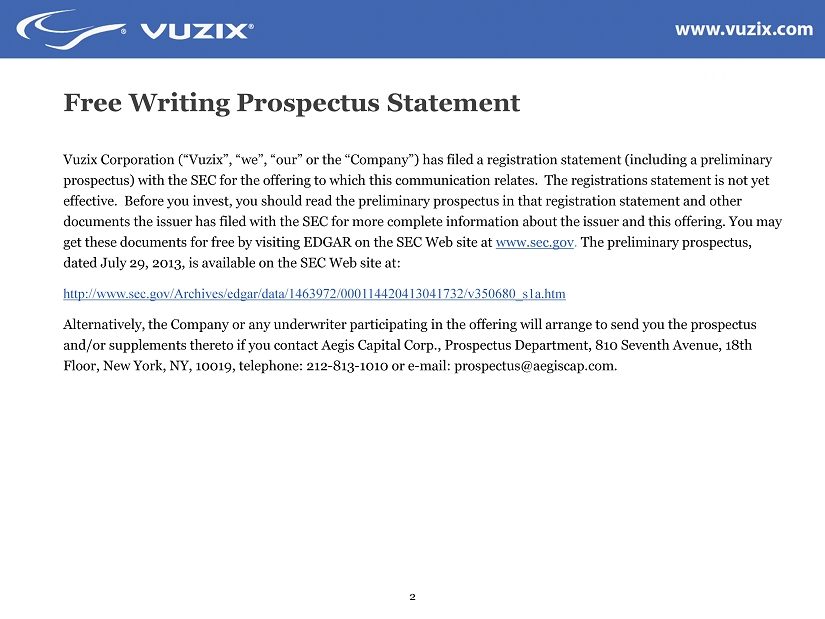 2 Free Writing Prospectus Statement Vuzix Corporation (“ Vuzix ”, “we”, “our” or the “Company”) has filed a registration statement (including a preliminary prospectus) with the SEC for the offering to which this communication relates. The registrations statement is not yet effective. Before you invest, you should read the preliminary prospectus in that registration statement and other documents the issuer has filed with the SEC for more complete information about the issuer and this offering. You may get these documents for free by visiting EDGAR on the SEC Web site at www.sec.gov . The preliminary prospectus, dated July 29, 2013, is available on the SEC Web site at: http:// www.sec.gov/Archives/edgar/data/1463972/000114420413041732/v350680_s1a.htm Alternatively , the Company or any underwriter participating in the offering will arrange to send you the prospectus and/or supplements thereto if you contact Aegis Capital Corp., Prospectus Department, 810 Seventh Avenue, 18th Floor, New York, NY, 10019, telephone: 212 - 813 - 1010 or e - mail: prospectus@aegiscap.com.