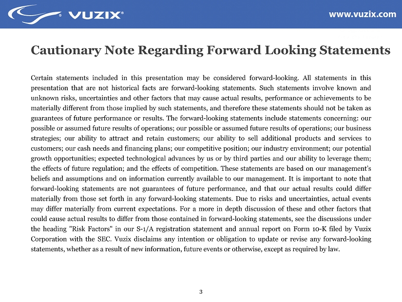 3 Certain statements included in this presentation may be considered forward - looking . All statements in this presentation that are not historical facts are forward - looking statements . Such statements involve known and unknown risks, uncertainties and other factors that may cause actual results, performance or achievements to be materially different from those implied by such statements, and therefore these statements should not be taken as guarantees of future performance or results . The forward - looking statements include statements concerning : our possible or assumed future results of operations ; our possible or assumed future results of operations ; our business strategies ; our ability to attract and retain customers ; our ability to sell additional products and services to customers ; our cash needs and financing plans ; our competitive position ; our industry environment ; our potential growth opportunities ; expected technological advances by us or by third parties and our ability to leverage them ; the effects of future regulation ; and the effects of competition . These statements are based on our management’s beliefs and assumptions and on information currently available to our management . It is important to note that forward - looking statements are not guarantees of future performance, and that our actual results could differ materially from those set forth in any forward - looking statements . Due to risks and uncertainties, actual events may differ materially from current expectations . For a more in depth discussion of these and other factors that could cause actual results to differ from those contained in forward - looking statements, see the discussions under the heading "Risk Factors" in our S - 1 /A registration statement and annual report on Form 10 - K filed by Vuzix Corporation with the SEC . Vuzix disclaims any intention or obligation to update or revise any forward - looking statements, whether as a result of new information, future events or otherwise, except as required by law . Cautionary Note Regarding Forward Looking Statements