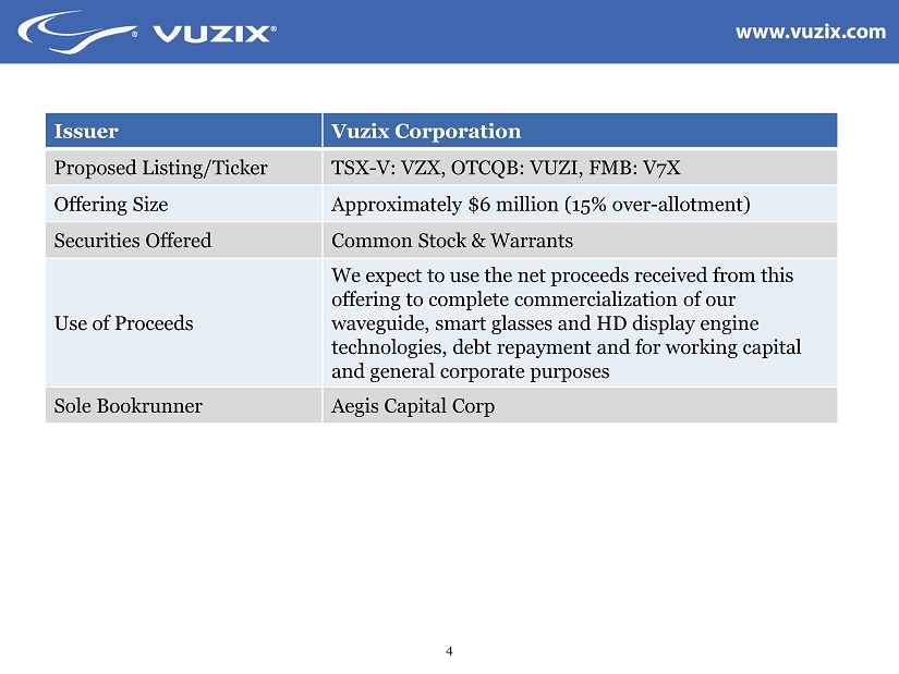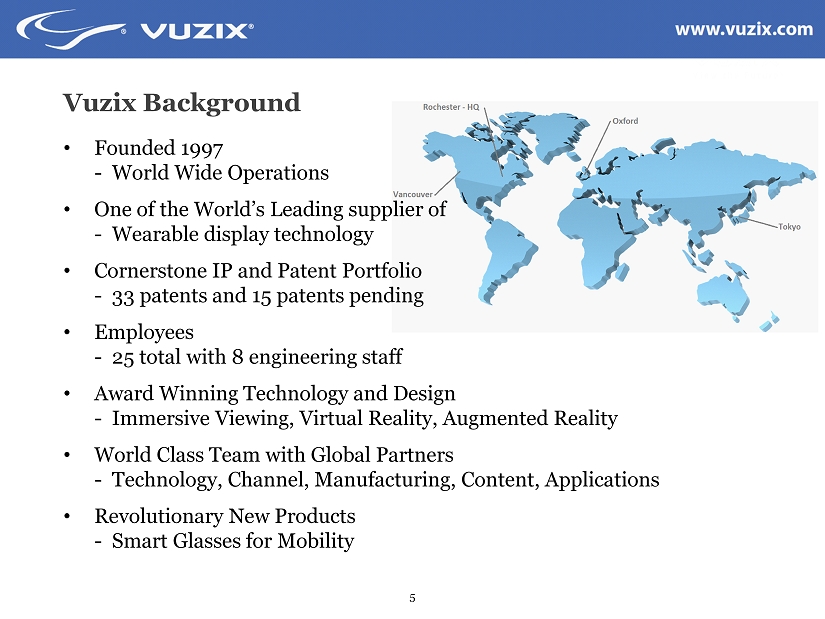 4 Offering Details Issuer Vuzix Corporation Proposed Listing/Ticker TSX - V: VZX, OTCQB: VUZI, FMB: V7X Offering Size Approximately $6 million (15% over - allotment) Securities Offered Common Stock & Warrants Use of Proceeds We expect to use the net proceeds received from this offering to complete commercialization of our waveguide, smart glasses and HD display engine technologies , debt repayment and for working capital and general corporate purposes Sole Bookrunner Aegis Capital Corp