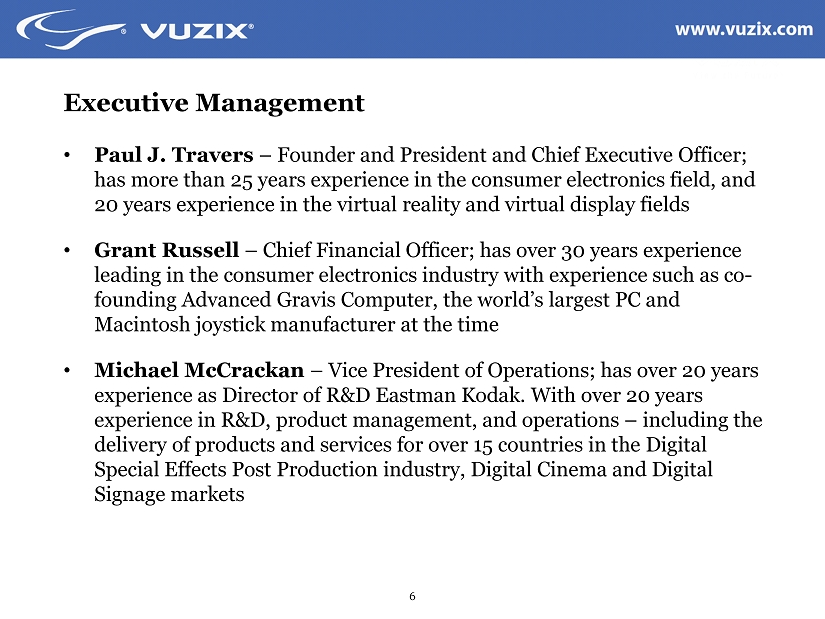 5 Vuzix Background • Founded 1997 - World Wide Operations • One of the World’s Leading supplier of - Wearable display technology • Cornerstone IP and Patent Portfolio - 33 patents and 15 patents pending • Employees - 25 total with 8 engineering staff • Award Winning Technology and Design - Immersive Viewing, Virtual Reality, Augmented Reality • World Class Team with Global Partners - Technology, Channel, Manufacturing, Content , Applications • Revolutionary New Products - Smart Glasses for Mobility