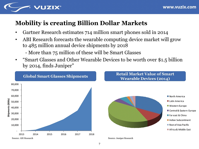 6 Executive Management • Paul J. Travers – Founder and President and Chief Executive Officer; has more than 25 years experience in the consumer electronics field, and 20 years experience in the virtual reality and virtual display fields • Grant Russell – Chief Financial Officer; has over 30 years experience leading in the consumer electronics industry with experience such as co - founding Advanced Gravis Computer, the world’s largest PC and Macintosh joystick manufacturer at the time • Michael McCrackan – Vice President of Operations; has over 20 years experience as Director of R&D Eastman Kodak. With over 20 years experience in R&D, product management, and operations – including the delivery of products and services for over 15 countries in the Digital Special Effects Post Production industry, Digital Cinema and Digital Signage markets
