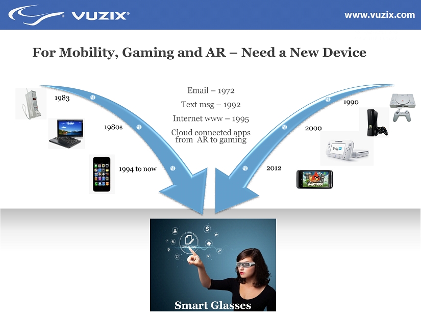 10 1983 1980s Email – 1972 Text msg – 1992 Internet www – 1995 Cloud connected apps from AR to gaming 1994 to now For Mobility, Gaming and AR – Need a New Device 1990 2000 2012 Smart Glasses
