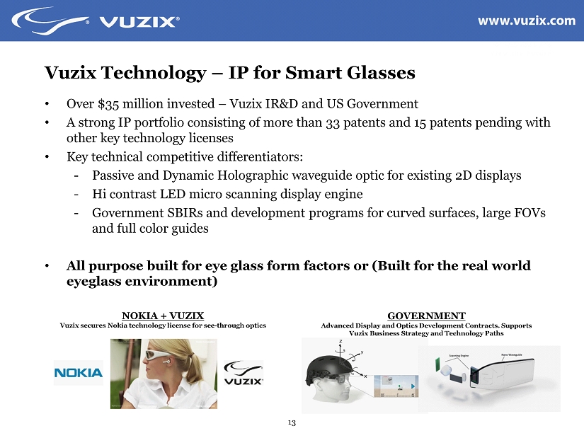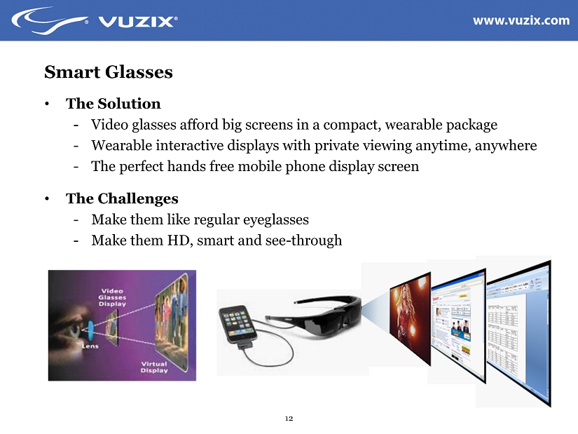 12 Smart Glasses • The Solution - Video glasses afford big screens in a compact, wearable package - Wearable interactive displays with private viewing anytime, anywhere - The perfect hands free mobile phone display screen • The Challenges - Make them like regular eyeglasses - Make them HD, smart and see - through