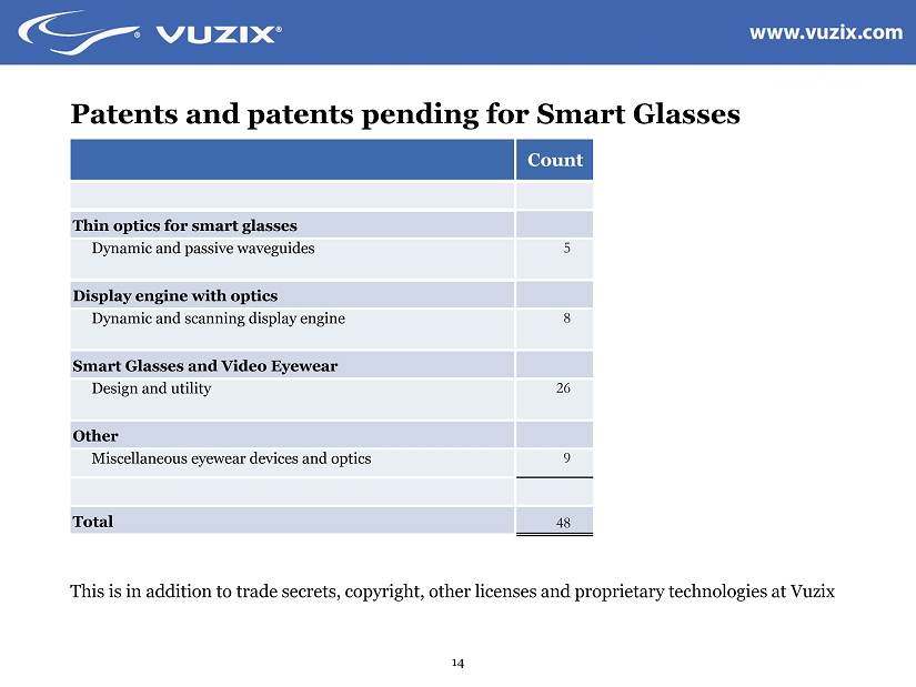 13 Vuzix Technology – IP for Smart Glasses GOVERNMENT Advanced Display and Optics Development Contracts. Supports Vuzix Business Strategy and Technology Paths • O ver $35 million invested – Vuzix IR&D and US Government • A strong IP portfolio consisting of more than 33 patents and 15 patents pending with other key technology licenses • Key technical competitive differentiators: - Passive and Dynamic Holographic waveguide optic for existing 2D displays - Hi contrast LED micro scanning display engine - Government SBIRs and development programs for curved surfaces, large FOVs and full color guides • All purpose built for eye glass form factors or (Built for the real world eyeglass environment) NOKIA + VUZIX Vuzix secures Nokia technology license for see - through optics