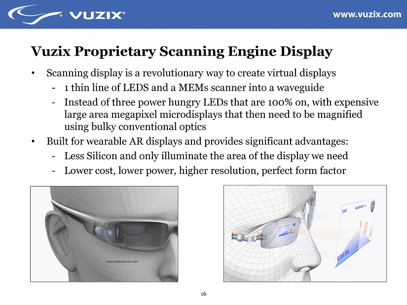 15 Vuzix Proprietary Waveguide Optics • Waveguides are a revolutionary way of moving light - Image is injected into a 1.4mm thin waveguide like a fiber optic - Not bent through bulk material like conventional optics • Provides a significant improvement in - Mass, cost, volume, simplicity and optical performance Conventional Optics Waveguide Optics