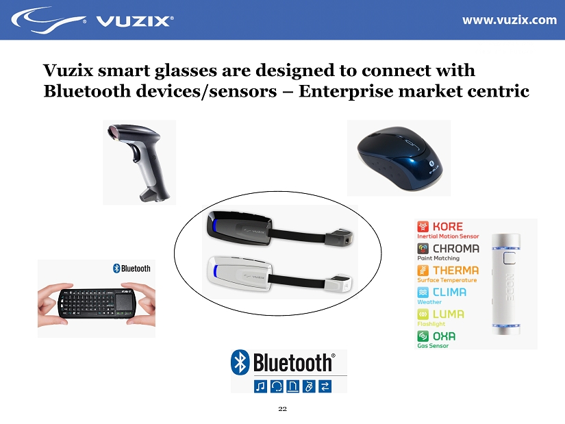 22 Vuzix smart glasses are d esigned to connect with Bluetooth devices/sensors – Enterprise market centric