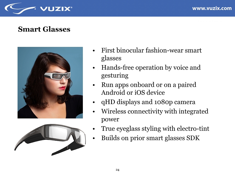 23 Vuzix Smart Glasses Standalone or Cloud Connected Native Apps run on M100 Standalone Enterprise Apps HMD Apps run on Smartphone iOS or Android Cooperative Related Apps run on Smartphone and M100 iOS or Android Cloud Optional, all modes