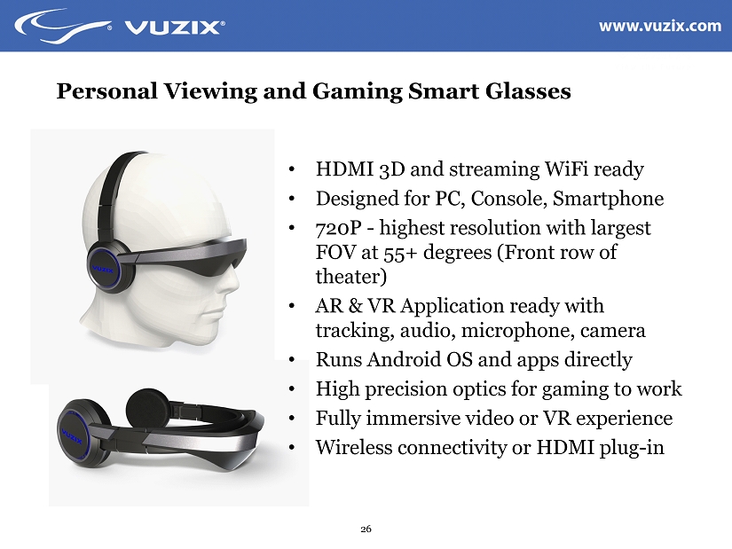 25 Industrial See through – M2000 for enterprise • First waveguide based solution • Ruggedized for industrial applications • 720p display and 1080p camera • M2000AR – currently HDMI connection • Programmable electronic shutter adjusts for indoor/outdoor use • HDMI version shipping early summer • Will be transforming to smart glasses • Will run apps onboard or on a paired Android or iOS device