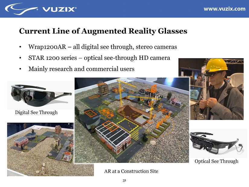 30 • Wide Screen Video Glasses - 52 & 75 inch v irtual screens • Virtual Reality Glasses - Includes head tracker • Limited by technology to standard definition CE Industry Award - Winning Products Last 9 Years Current Line of Video Eyewear
