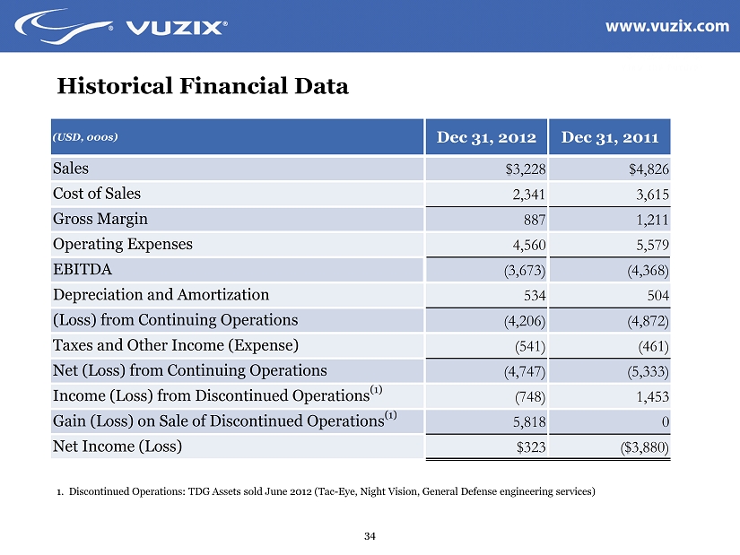 34 (USD, 000s) Dec 31, 2012 Dec 31, 2011 Sales $3,228 $4,826 Cost of Sales 2,341 3,615 Gross Margin 887 1,211 Operating Expenses 4,560 5,579 EBITDA (3,673) (4,368) Depreciation and Amortization 534 504 (Loss) from Continuing Operations (4,206) (4,872) Taxes and Other Income (Expense) (541) (461) Net (Loss) from Continuing Operations (4,747) (5,333) Income (Loss) from Discontinued Operations (1) (748) 1,453 Gain (Loss) on Sale of Discontinued Operations (1) 5,818 0 Net Income (Loss) $323 ($3,880) Historical Financial Data 1. Discontinued Operations: TDG Assets sold June 2012 (Tac - Eye, Night Vision, General Defense engineering services)