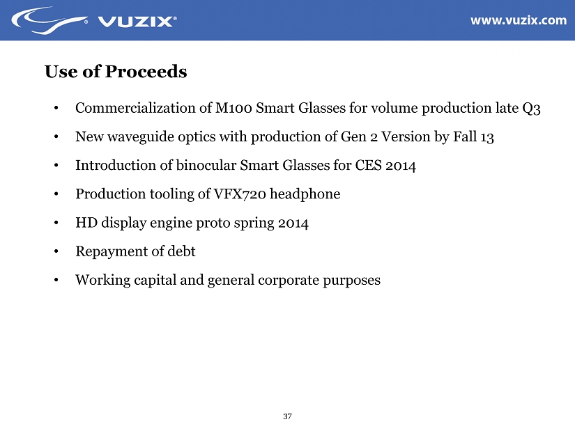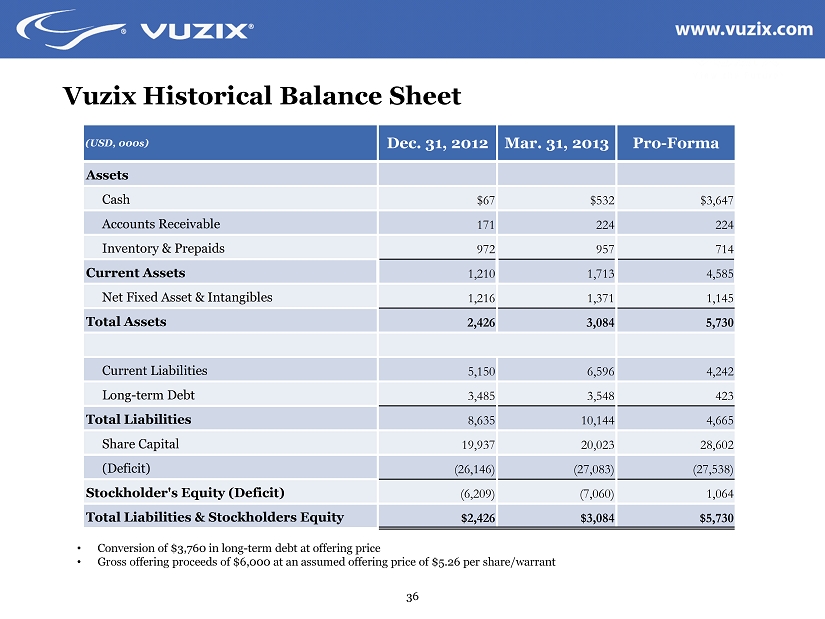 36 (USD, 000s) Dec. 31, 2012 Mar. 31, 2013 Pro-Forma Assets Cash $67 $532 $3,647 Accounts Receivable 171 224 224 Inventory & Prepaids 972 957 714 Current Assets 1,210 1,713 4,585 Net Fixed Asset & Intangibles 1,216 1,371 1,145 Total Assets 2,426 3,084 5,730 Current Liabilities 5,150 6,596 4,242 Long-term Debt 3,485 3,548 423 Total Liabilities 8,635 10,144 4,665 Share Capital 19,937 20,023 28,602 (Deficit) (26,146) (27,083) (27,538) Stockholder's Equity (Deficit) (6,209) (7,060) 1,064 Total Liabilities & Stockholders Equity $2,426 $3,084 $5,730 Vuzix Historical Balance Sheet • Conversion of $3,760 in long - term debt at offering price • Gross offering proceeds of $6,000 at an assumed offering price of $5.26 per share/warrant