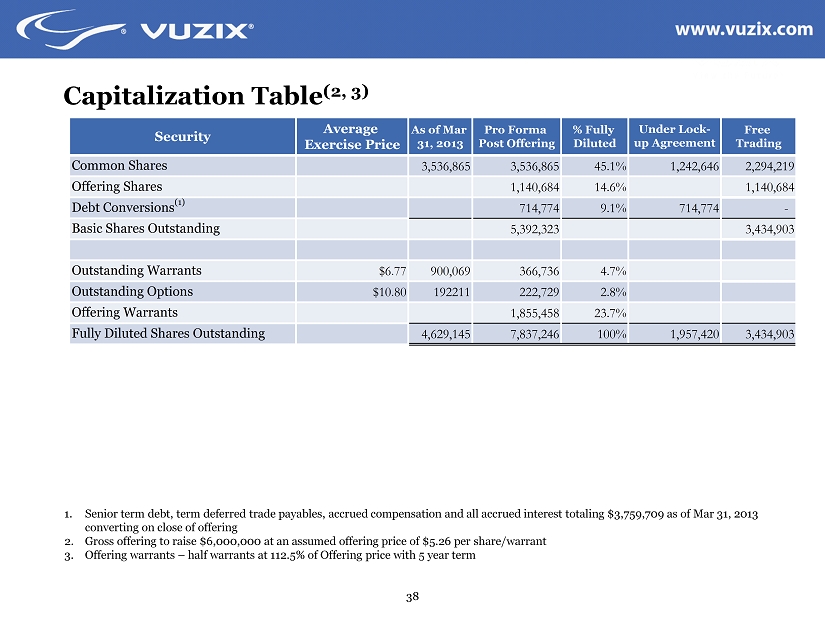 37 Use of Proceeds • Commercialization of M100 Smart Glasses for volume production late Q3 • New waveguide optics with production of Gen 2 Version by Fall 13 • Introduction of binocular Smart Glasses for CES 2014 • Production tooling of VFX720 headphone • HD display engine proto spring 2014 • Repayment of debt • Working capital and general corporate purposes