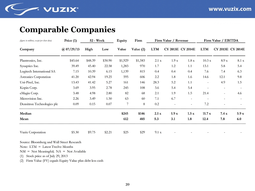 39 (figures in millions, except per share data) Price (1) 52 - Week Equity Firm Firm Value / Revenue Firm Value / EBITDA Company @ 07/29/13 High Low Value Value (2) LTM CY 2013E CY 2014E LTM CY 2013E CY 2014E Plantronics, Inc. $45.64 $48.39 $30.90 $1,929 $1,583 2.1 x 1.9 x 1.8 x 10.3 x 8.9 x 8.1 x Synaptics Inc. 39.49 45.40 22.58 1,283 970 1.7 1.2 1.1 13.1 5.8 5.4 Logitech International SA 7.15 10.39 6.15 1,139 815 0.4 0.4 0.4 7.6 7.4 6.3 Astronics Corporation 41.20 42.94 19.25 595 606 2.2 1.8 1.6 14.6 12.1 9.8 Uni-Pixel, Inc. 13.43 41.42 5.27 161 146 28.3 5.2 1.1 - 4.9 1.5 Kopin Corp. 3.69 3.95 2.78 245 108 3.6 5.4 5.4 - - - eMagin Corp. 3.48 4.98 2.80 82 68 2.1 1.9 1.5 21.4 - 4.6 Microvision Inc. 2.26 3.49 1.50 63 60 7.1 6.7 - - - - Densitron Technologies plc 0.09 0.15 0.07 7 8 0.2 - - 7.2 - - Median $245 $146 2.1 x 1.9 x 1.5 x 11.7 x 7.4 x 5.9 x Mean 612 485 5.3 3.1 1.8 12.4 7.8 6.0 Vuzix Corporation $5.30 $9.75 $2.21 $25 $29 9.1 x - - - - - Source: Bloomberg and Wall Street Research Note: LTM = Latest Twelve Months NM = Not Meaningful; NA = Not Available (1) Stock price as of July 29, 2013 (2) Firm Value (FV) equals Equity Value plus debt less cash Comparable Companies