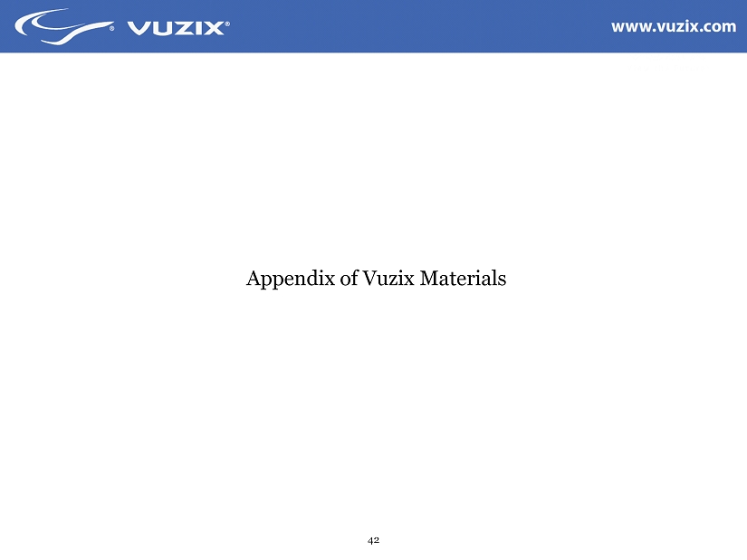 40 Vuzix Investment Highlights • A cknowledged as one the world leaders in Smart Glasses, established over the last 20 years, and at the front end of market opportunities in the billions of dollars • A clear vision of the important role that mobile displays will play in the future • Strong R&D plan to commercialize its next generation technology for both Vuzix and potential third party OEMs and licensees • A comprehensive roadmap for the future of Smart Glasses • Strong new product portfolio being unveiled in 2013/14 • Pursuing high growth and margin opportunities in burgeoning wearable tech markets
