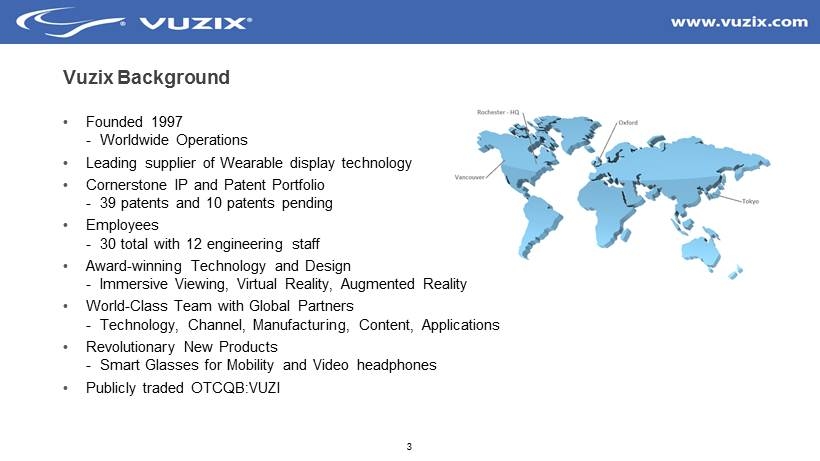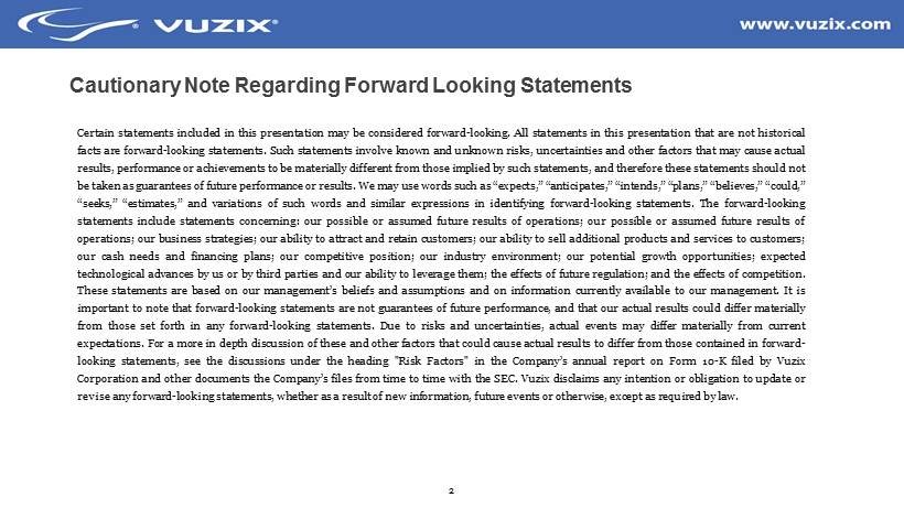2 Cautionary Note Regarding Forward Looking Statements Certain statements included in this presentation may be considered forward - looking . All statements in this presentation that are not historical facts are forward - looking statements . Such statements involve known and unknown risks, uncertainties and other factors that may cause actual results, performance or achievements to be materially different from those implied by such statements, and therefore these statements should not be taken as guarantees of future performance or results . We may use words such as “expects,” “anticipates,” “intends,” “plans,” “believes,” “could,” “seeks,” “estimates,” and variations of such words and similar expressions in identifying forward - looking statements . The forward - looking statements include statements concerning : our possible or assumed future results of operations ; our possible or assumed future results of operations ; our business strategies ; our ability to attract and retain customers ; our ability to sell additional products and services to customers ; our cash needs and financing plans ; our competitive position ; our industry environment ; our potential growth opportunities ; expected technological advances by us or by third parties and our ability to leverage them ; the effects of future regulation ; and the effects of competition . These statements are based on our management’s beliefs and assumptions and on information currently available to our management . It is important to note that forward - looking statements are not guarantees of future performance, and that our actual results could differ materially from those set forth in any forward - looking statements . Due to risks and uncertainties, actual events may differ materially from current expectations . For a more in depth discussion of these and other factors that could cause actual results to differ from those contained in forward - looking statements, see the discussions under the heading "Risk Factors" in the Company’s annual report on Form 10 - K filed by Vuzix Corporation and other documents the Company’s files from time to time with the SEC . Vuzix disclaims any intention or obligation to update or revise any forward - looking statements, whether as a result of new information, future events or otherwise, except as required by law .