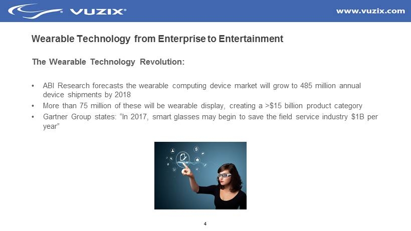 3 Vuzix Background • Founded 1997 - Worldwide Operations • Leading supplier of Wearable display technology • Cornerstone IP and Patent Portfolio - 39 patents and 10 patents pending • Employees - 30 total with 12 engineering staff • Award - winning Technology and Design - Immersive Viewing, Virtual Reality, Augmented Reality • World - Class Team with Global Partners - Technology, Channel, Manufacturing, Content, Applications • Revolutionary New Products - Smart Glasses for Mobility and Video headphones • Publicly traded OTCQB:VUZI