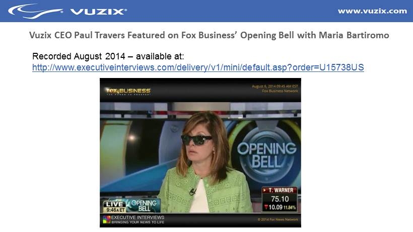 5 Vuzix CEO Paul Travers Featured on Fox Business’ Opening Bell with Maria Bartiromo Recorded August 2014 – available at: http :// www.executiveinterviews.com/delivery/v1/mini/default.asp?order=U15738US