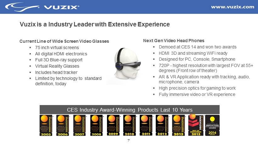 6 Why Wearable Displays? The Solution ▪ Video glasses afford big screens in a compact, wearable package ▪ Wearable interactive displays can connect the cloud to the real world (AR) ▪ The perfect hands - free mobile phone display screen for private viewing anytime, anywhere The Challenges – But its not easy to do well ▪ Make them look and feel like regular eyeglasses ▪ Make them HD, smart and see - through