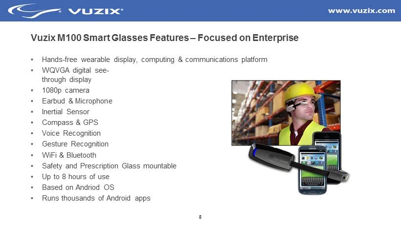 7 Vuzix is a Industry Leader with Extensive Experience Current Line of Wide Screen Video Glasses ▪ 75 inch virtual screens ▪ All digital HDMI electronics ▪ Full 3D Blue - ray support ▪ Virtual Reality Glasses ▪ Includes head tracker ▪ Limited by technology to standard definition, today CES Industry Award - Winning Products Last 10 Years Next Gen Video Head Phones ▪ Demoed at CES 14 and won two awards ▪ HDMI 3D and streaming WiFi ready ▪ Designed for PC, Console, Smartphone ▪ 720P - highest resolution with largest FOV at 55+ degrees (Front row of theater) ▪ AR & VR Application ready with tracking, audio, microphone, camera ▪ High precision optics for gaming to work ▪ Fully immersive video or VR experience