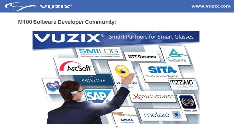 8 Vuzix M100 Smart Glasses Features – Focused on Enterprise • Hands - free wearable display, computing & communications platform • WQVGA digital see - through display • 1080p camera • Earbud & Microphone • Inertial Sensor • Compass & GPS • Voice Recognition • Gesture Recognition • WiFi & Bluetooth • Safety and Prescription Glass mountable • Up to 8 hours of use • Based on Andriod OS • Runs thousands of Android apps