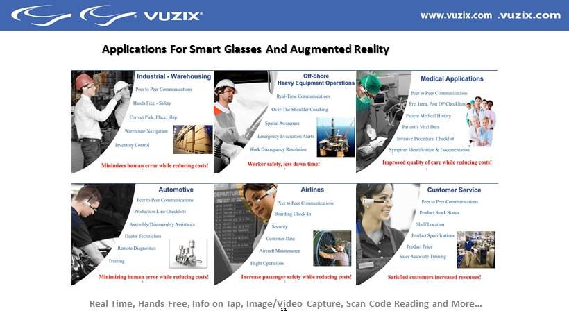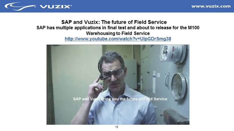 13 SAP and Vuzix : The future of Field Service SAP has multiple applications in final test and about to release for the M100 Warehousing to Field Service http:// www.youtube.com/watch?v=UlpGDrSmg38