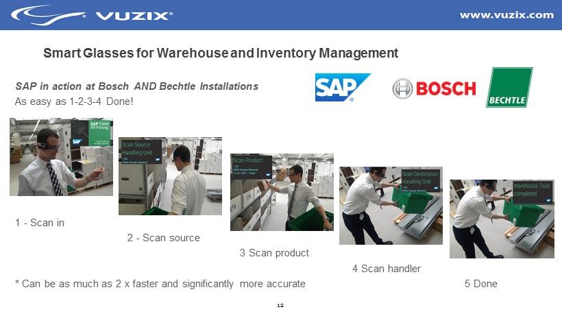 12 Smart Glasses for Warehouse and Inventory Management SAP in action at Bosch AND Bechtle Installations As easy as 1 - 2 - 3 - 4 Done! 1 - Scan in 2 - Scan source 3 Scan product 4 Scan handler * Can be as much as 2 x faster and significantly more accurate 5 Done