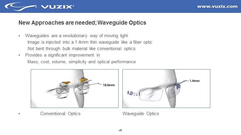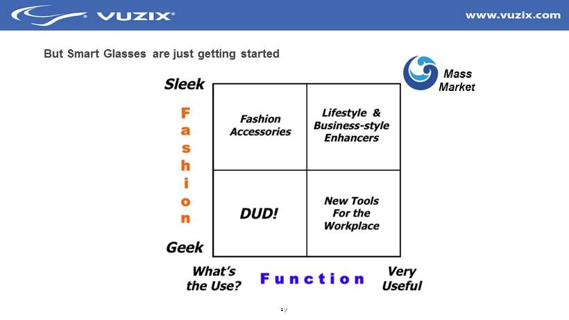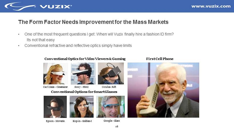 16 The F orm F actor Needs Improvement for the Mass Markets • One of the most frequent questions I get: When will Vuzix finally hire a fashion ID firm? Its not that easy • Conventional refractive and reflective optics simply have limits Conventional Optics for Video Viewers & Gaming First Cell Phone Conventional Options for Smart Glasses Carl Zeiss - Cinemizer Sony - HMZ Epson - Moverio Google - Glass Kopin - Golden - I Oculus - Rift