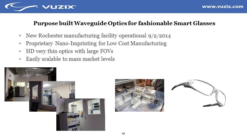18 New Approaches are needed; Waveguide Optics • Waveguides are a revolutionary way of moving light Image is injected into a 1.4mm thin waveguide like a fiber optic Not bent through bulk material like conventional optics • Provides a significant improvement in Mass, cost, volume, simplicity and optical performance • Conventional Optics Waveguide Optics